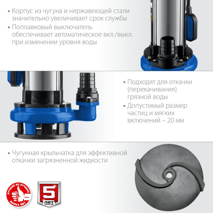 Автоматическое включение и выключение, термопредохранитель для защиты двигателя, высокие эксплуатационные свойства и простота конструкции обеспечивают надёжное и безопасное применение в хозяйственно-бытовых целях для перекачивания грязной воды, сточных и бытовых вод, при осушении ёмкостей и водоёмов, организации забора воды с глубины (колодцы) и подачи на высоту, использовании в системах аэрации и дренажа. Для увеличения срока службы насоса используются материалы только высокого качества. При помощи этого насоса вы без труда решите поставленную задачу.