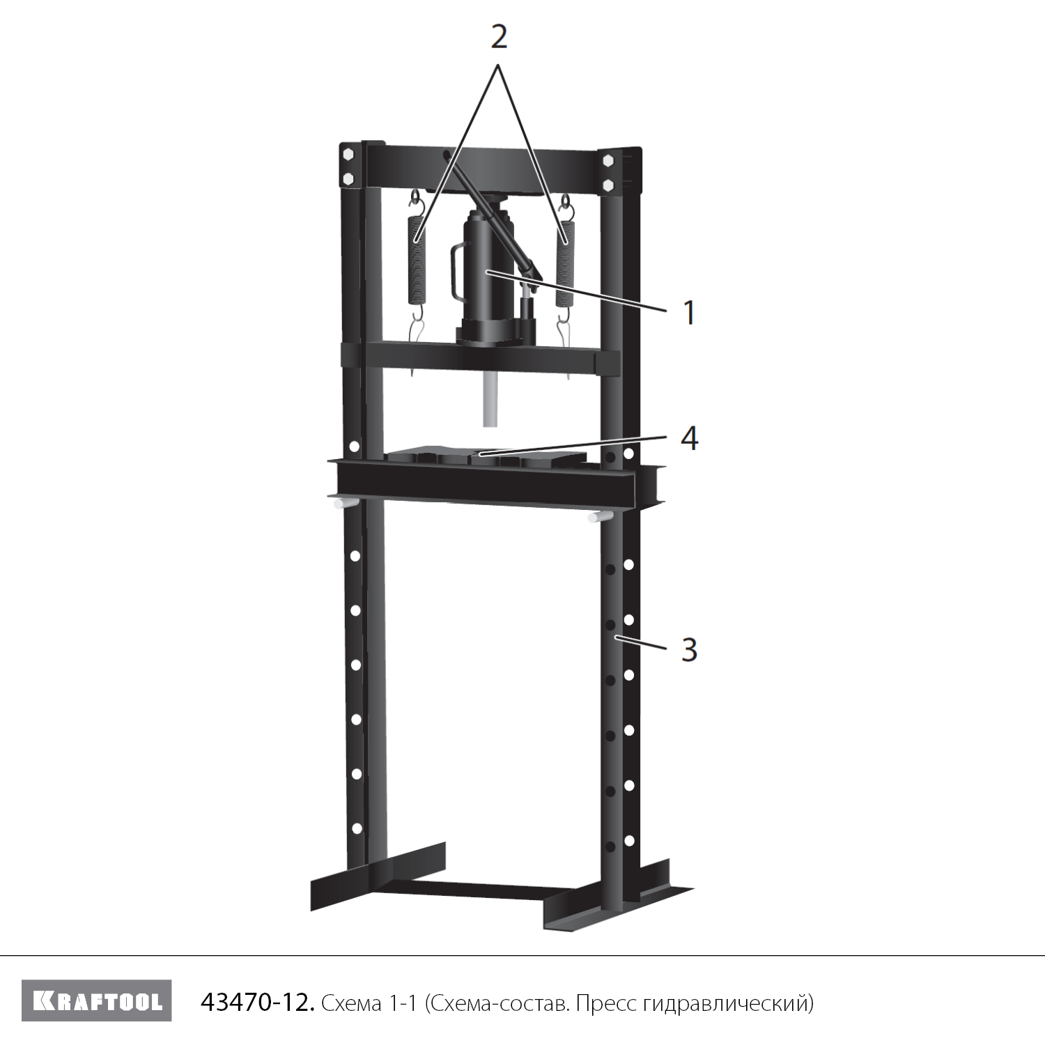 Пресс KRAFTOOL - мощный инструмент для запрессовки деталей. Отличается прочной металлической конструкцией. Широкое Н-образное основание надежно крепится к полу анкерными болтами. Силовым элементом пресса является домкрат, который при работе опускает подъемную платформу и запрессовывает деталь