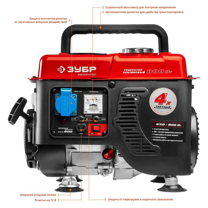 ДЛЯ КЕМПИНГА Уникальное сочетание - портативность и серьезность конструкции. Компактный корпус, небольшой вес - и полноценный четырехтактный двигатель и генератор с системой стабилизации выходного напряжения. Все это в сочетании с удобным управлением и простотой обслуживания делает генератор ЗУБР лидером в своем сегменте