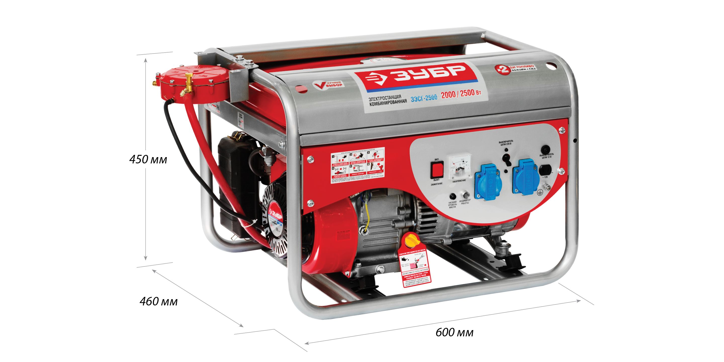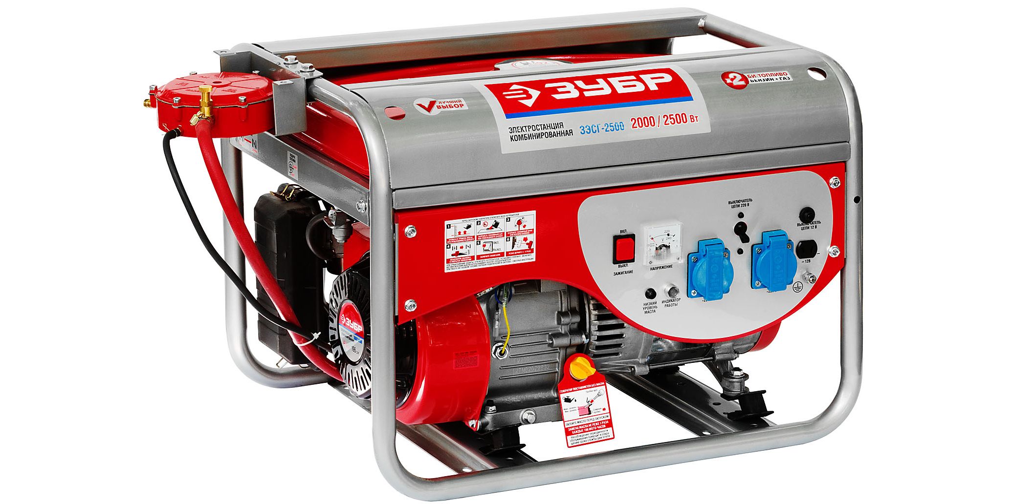 Компактный двухтопливный электрогенератор мощностью 2.5 кВт, работающих как на бензине (АИ-92), так и на газе – при этом, для использования газа не требуется установка дополнительного оборудования. Такой генератор отлично подходит для снабжения маломощных инструментов и оборудования в условиях строительной площадки или автосервиса, а также для обеспечения электричеством небольших дачных домов.