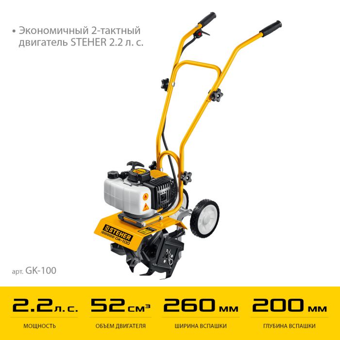 Лёгкий и манёвренный культиватор с двухтактным двигателем для рыхления и культивации почвы на приусадебном участке. Сошник позволяет контролировать величину заглубления. Складная рукоятка и транспортные колеса облегчают эксплуатацию, транспортировку и хранение.