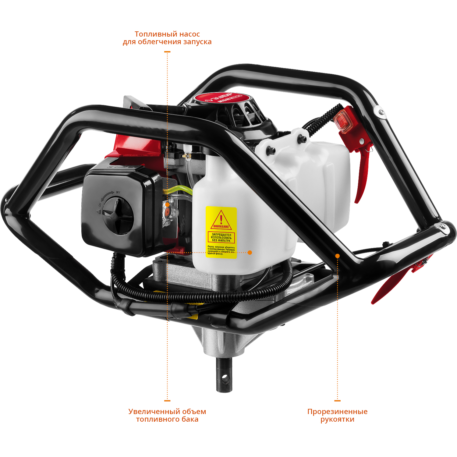 Мощный инструмент для бурения отверстий в мягких, твердых, мерзлых грунтах, а также во льду. Мощный 2-х тактный двигатель и универсальная конструкция рамы позволяют быстро и эффективно произвести необходимые работы по бурению. Конструкция рамы мотобура позволяет работать как одному, так и двум операторам, что повышает эффективность бурения, кроме того обеспечивает дополнительную сохранность двигателя при работе и транспортировке.