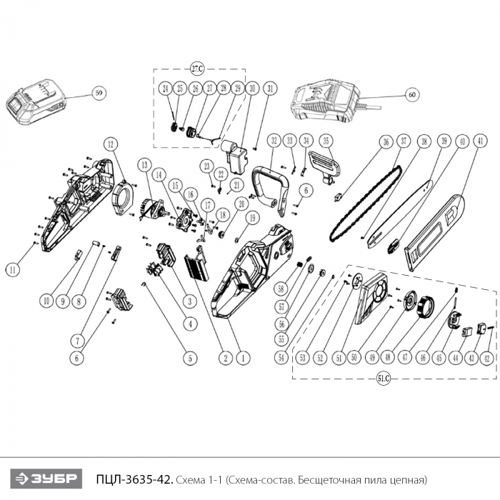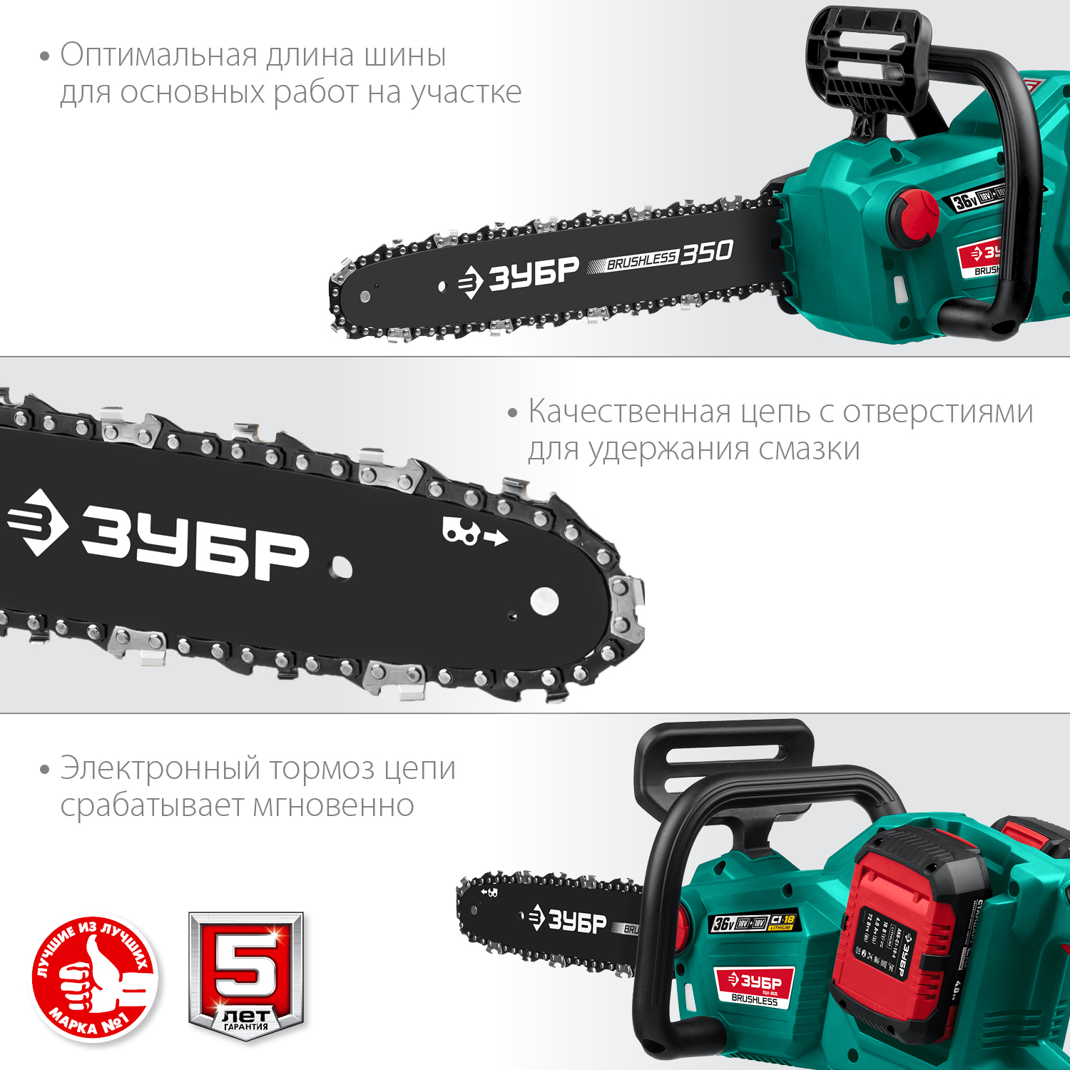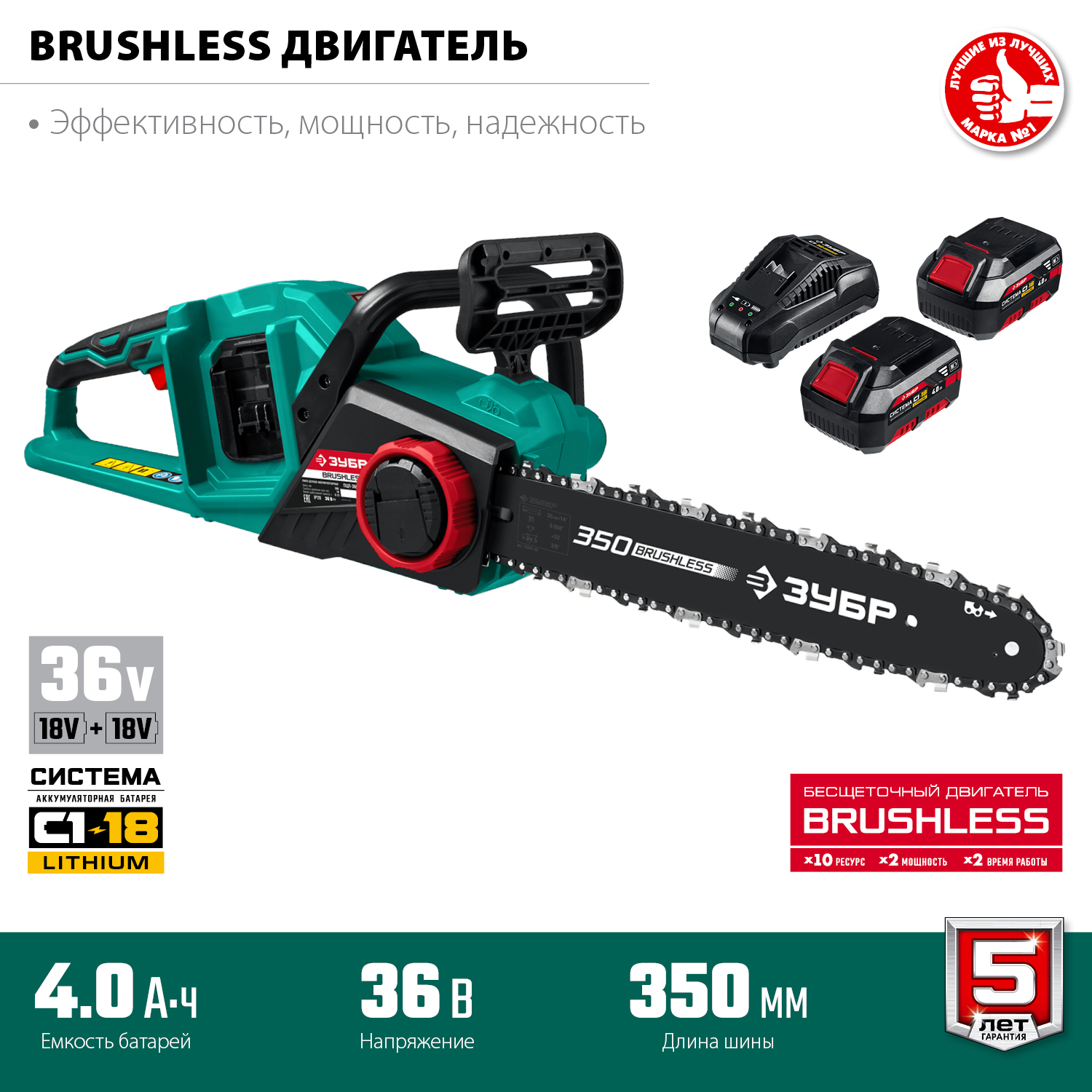 Бесщеточная пила цепная, 2 АКБ (4 Ач) ПЦЛ-3635-42
