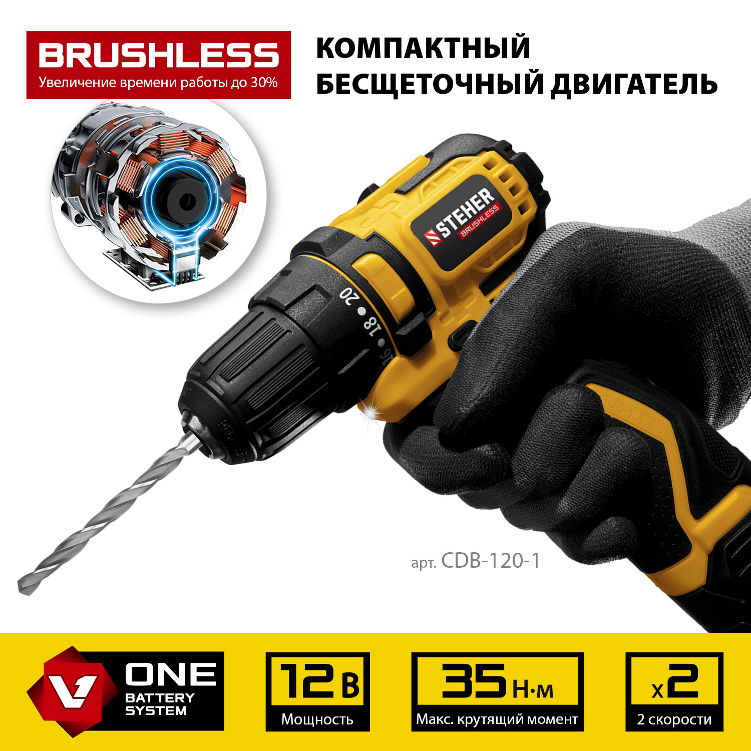 Бесщеточная дрель-шуруповерт, 1 АКБ (2 Ач), в кейсе CDB-120-1
