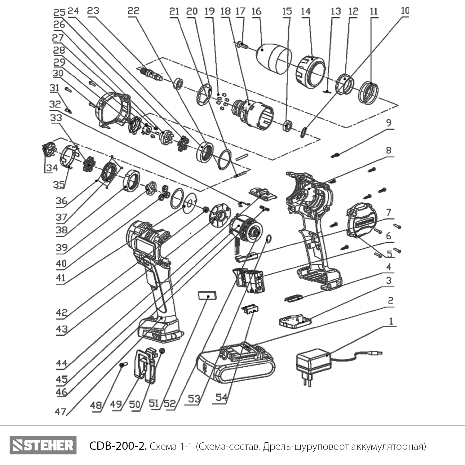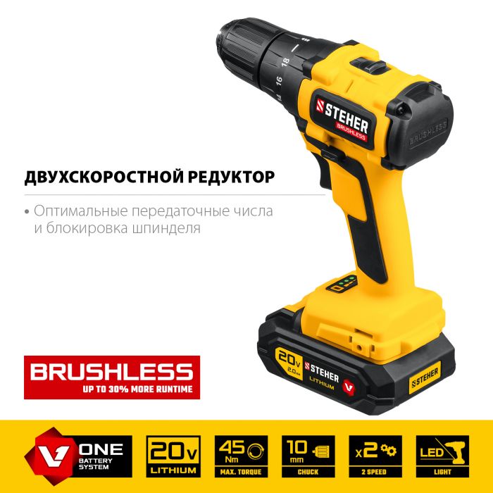 Бесщеточная дрель-шуруповерт, 2 АКБ V1 (2 Ач), в кейсе CDB-200-2