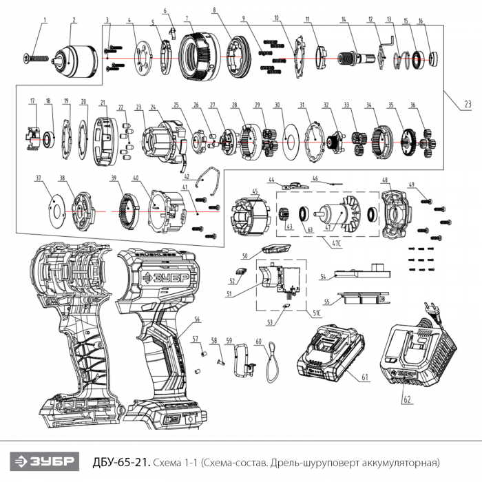 Бесщеточная ударная дрель-шуруповерт, 1 АКБ LMS (2 Ач), в коробке ДБУ-65-21