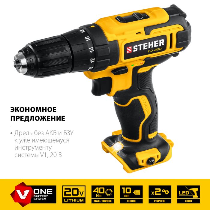Новый недорогой шуруповерт Steher - помощник в сверлении и заворачивании. Индивидуальный дизайн, удобная эргономика, высокие скорость и крутящий момент обеспечивают комфортную и производительную работу. Очень выгодное предложение для имеющих инструменты серии V-ONE. ″Мягкая″ муфта с минимальным крутящим моментом 0.2 Нм позволяет работать с компьютерными винтиками или мебельной отделкой