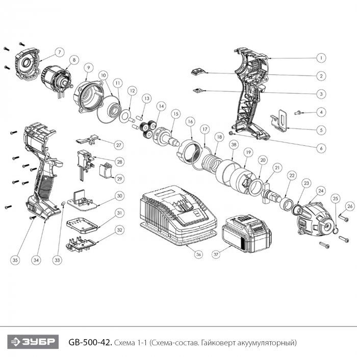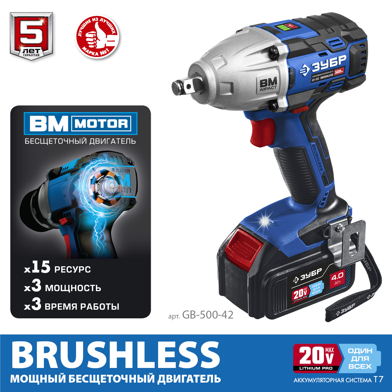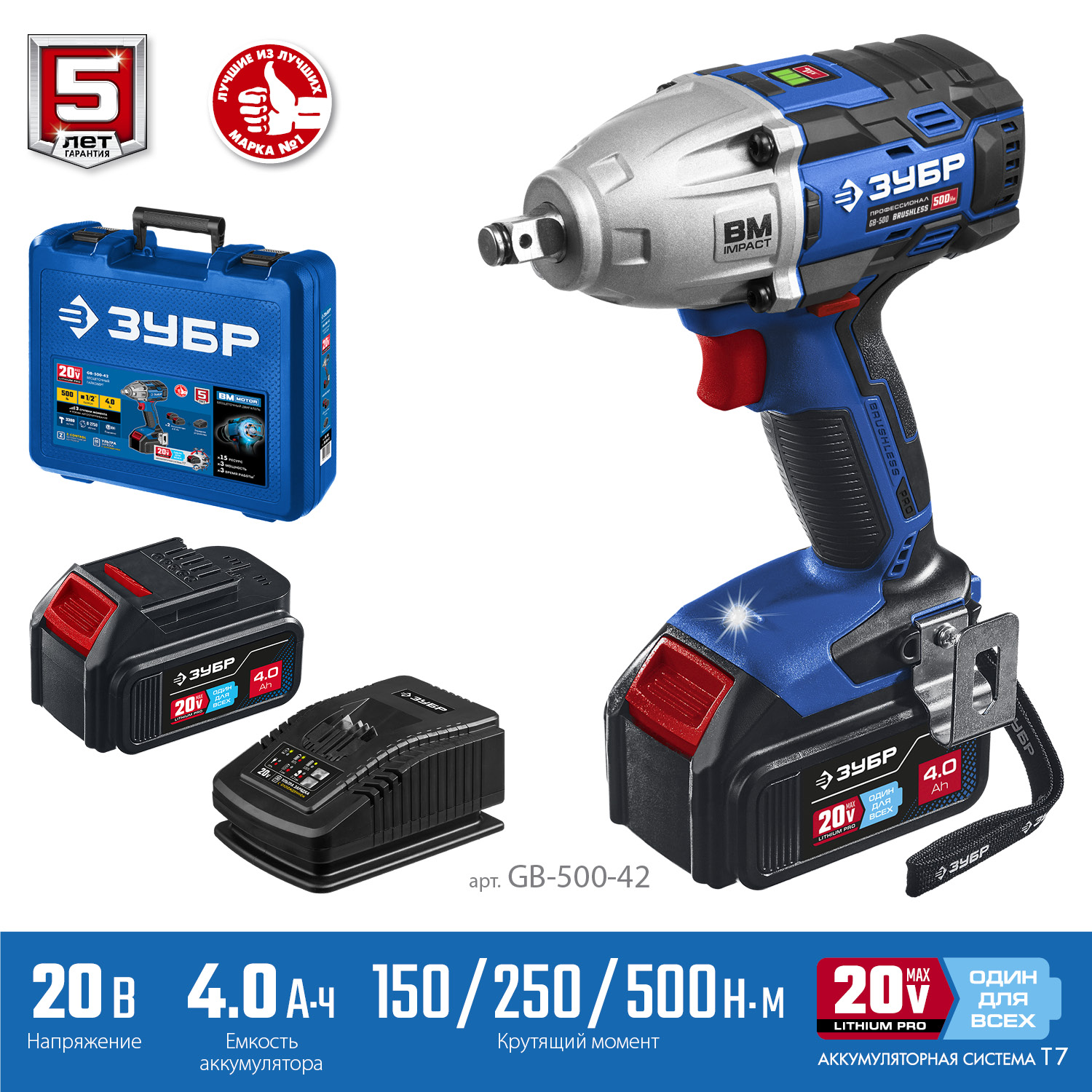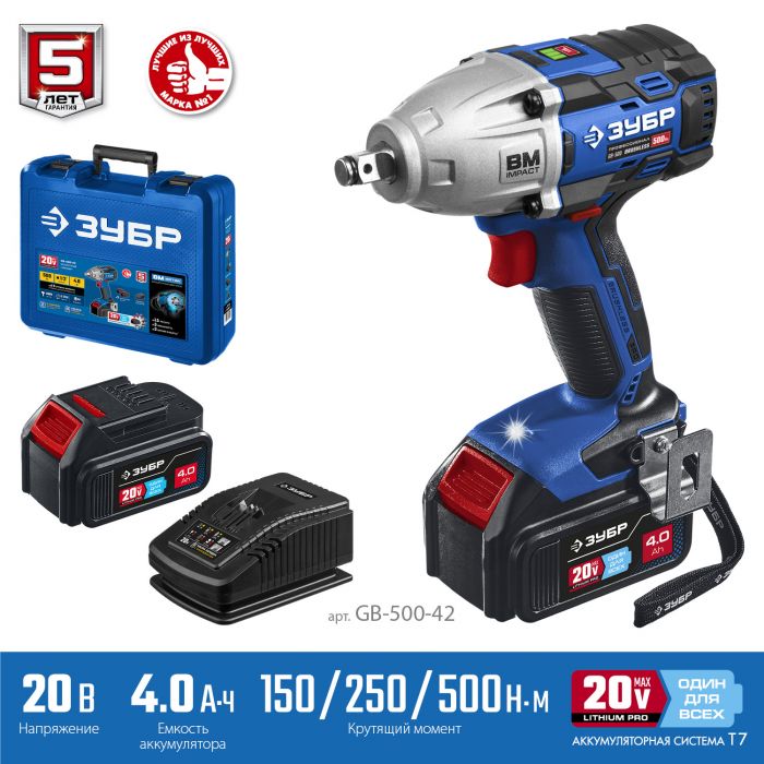 Ударный бесщеточный гайковерт, 2 АКБ T7 (4 Ач), в кейсе GB-500-42