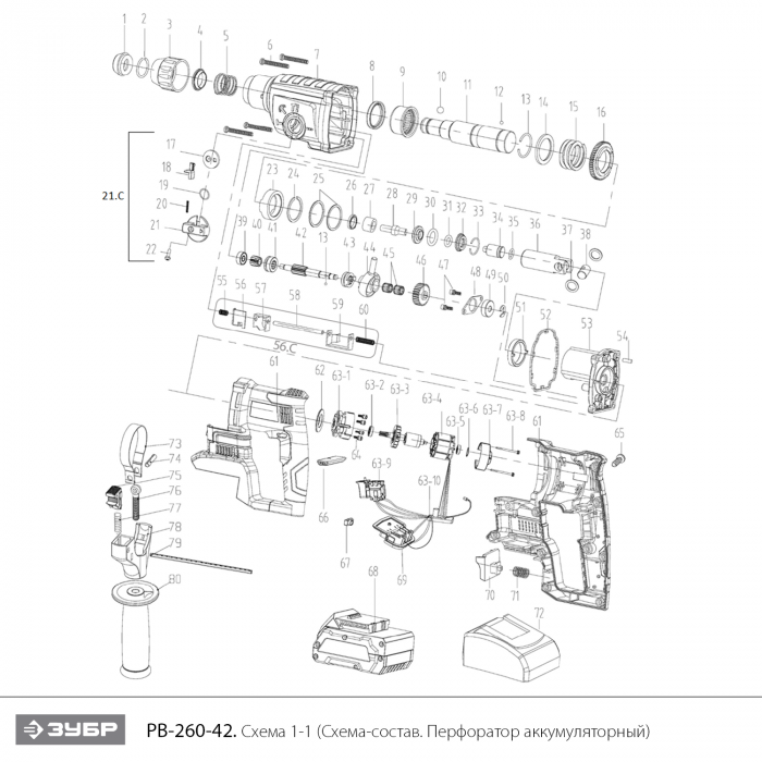 Бесщеточный перфоратор, 2 АКБ T7 (4 Ач), в кейсе PB-260-42