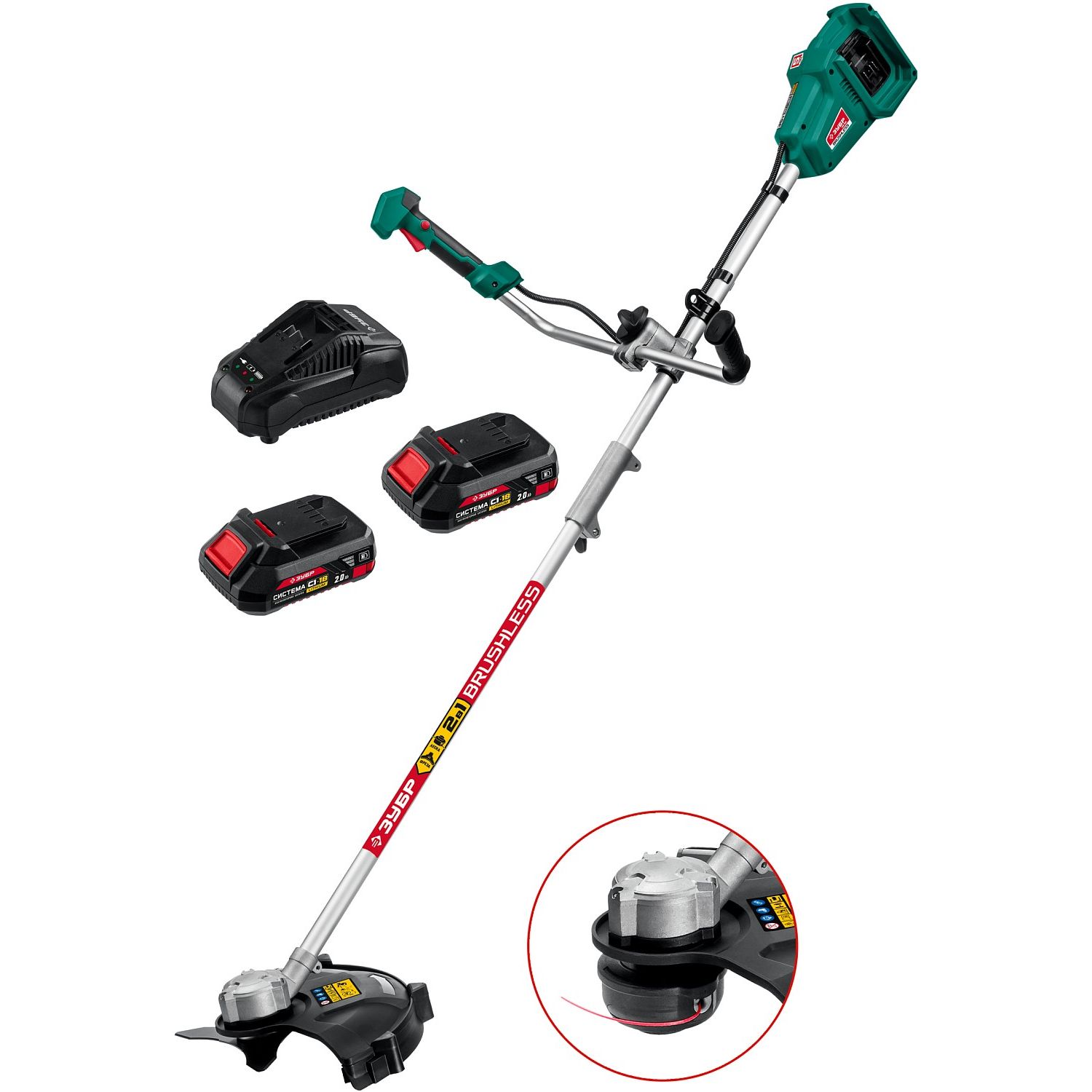 Универсальный инструмент на участке, способный заменить газонокосилку и триммер. Оснащается катушкой с леской (для мягкой растительности) и ножом (для грубой растительности). Большая мощность двигателя BRUSHLESS и две батареи позволяют косить довольно густую и грубую растительность длительное время