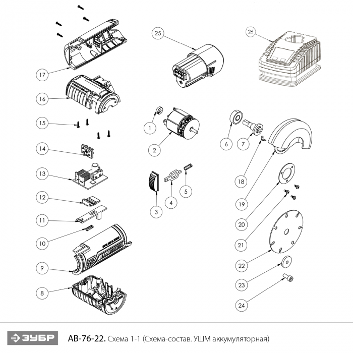 Бесщеточная УШМ, 2 АКБ (2 Ач), в сумке AB-76-22