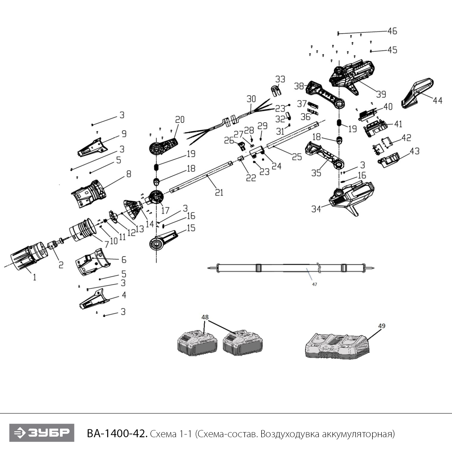 Воздуходувка аккумуляторная 40 В (2x20В), 2 АКБ LMS (4 Ач) ВА-1400-42