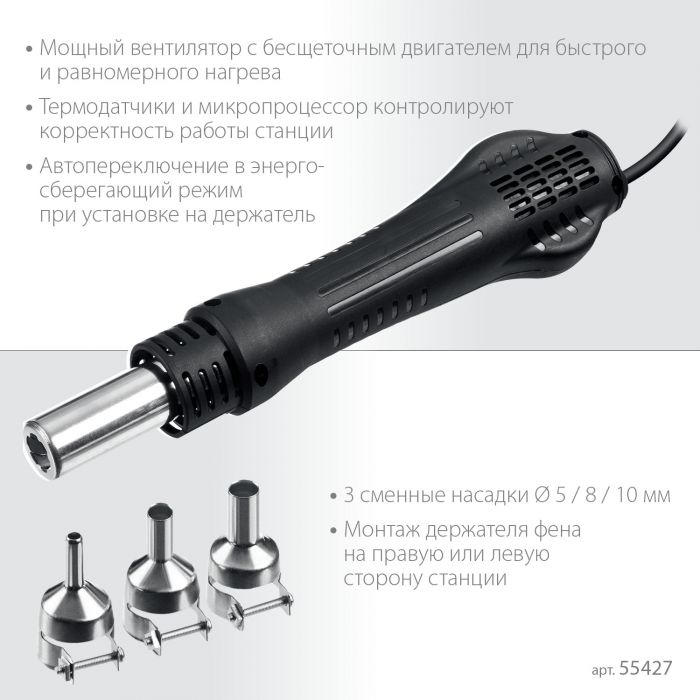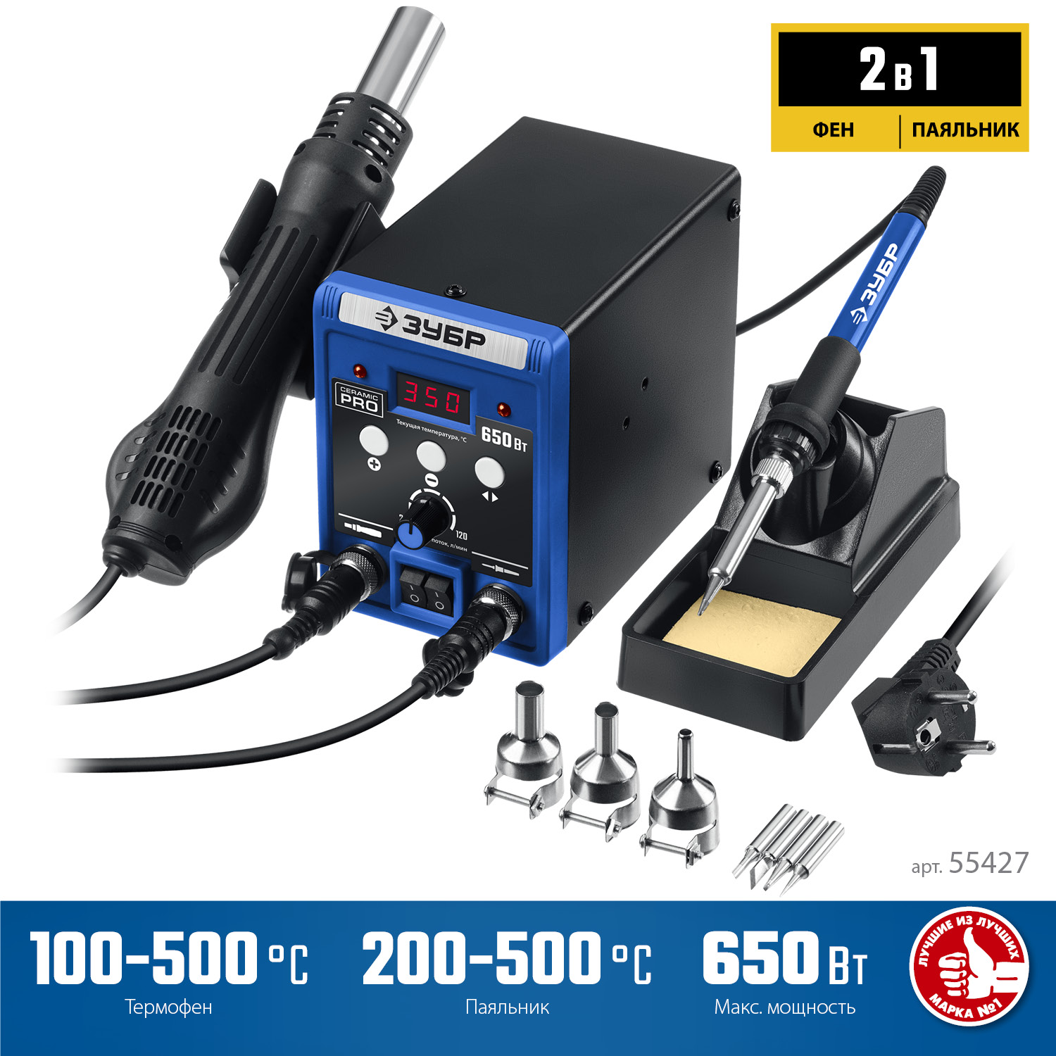 ЗУБР ПСР-650, 2-в-1 ремонтная паяльная станция, 100-500°С, 650 Вт. 55427
