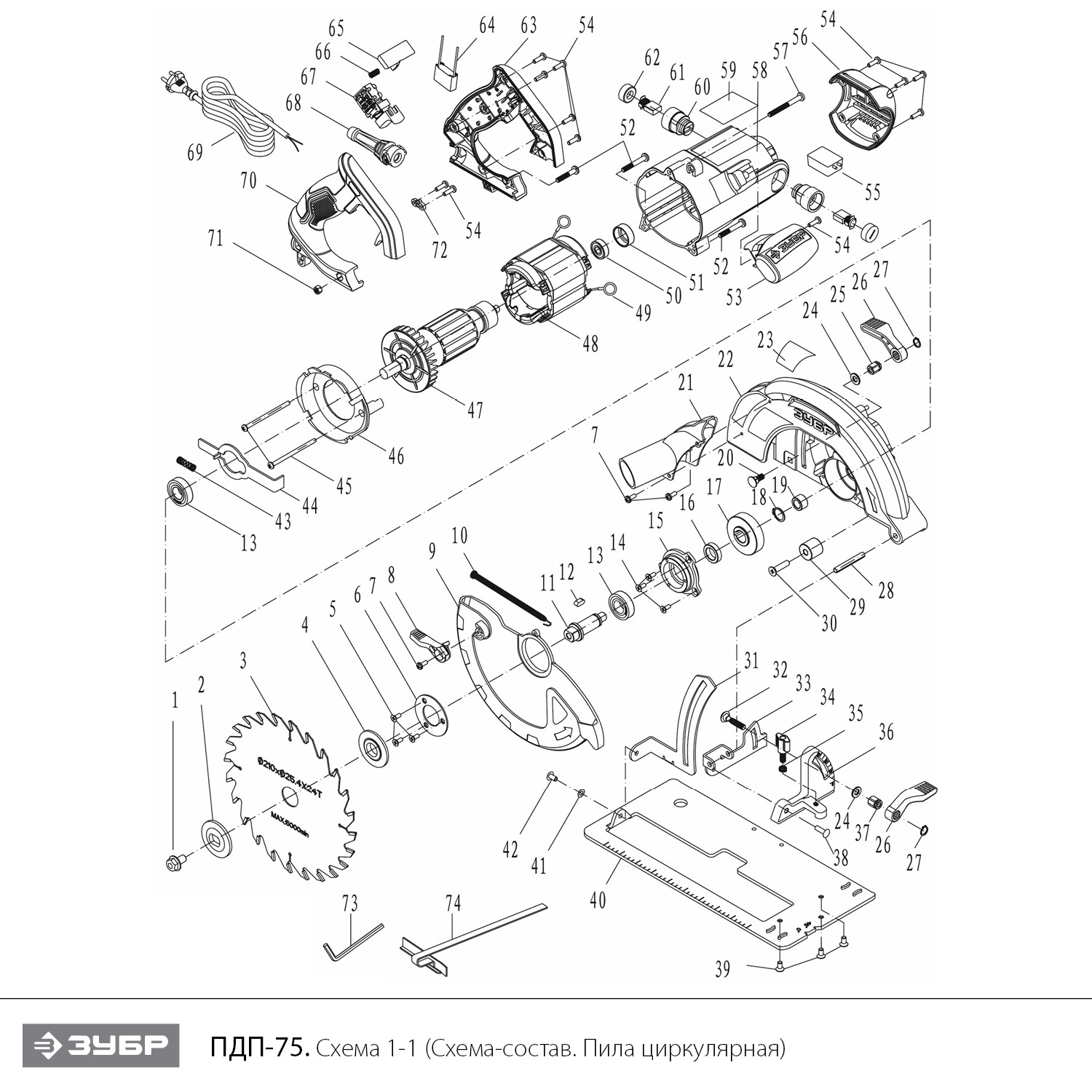 Циркулярная пила для всех видов распиловочных работ в серии профессионального инструмента ЗУБР. Максимальная глубина пиления 75 мм позволяет пилить все виды фанеры, любые листовые материалы, а также большинство типоразмеров досок и некоторые виды брусков. Жесткая конструкции обеспечивает точность пиления, плавный пуск устраняет начальный рывок, а удобные рычаги фиксации выбранных настроек и оптимальная эргономика рукояток помогают работать быстрее и комфортнее