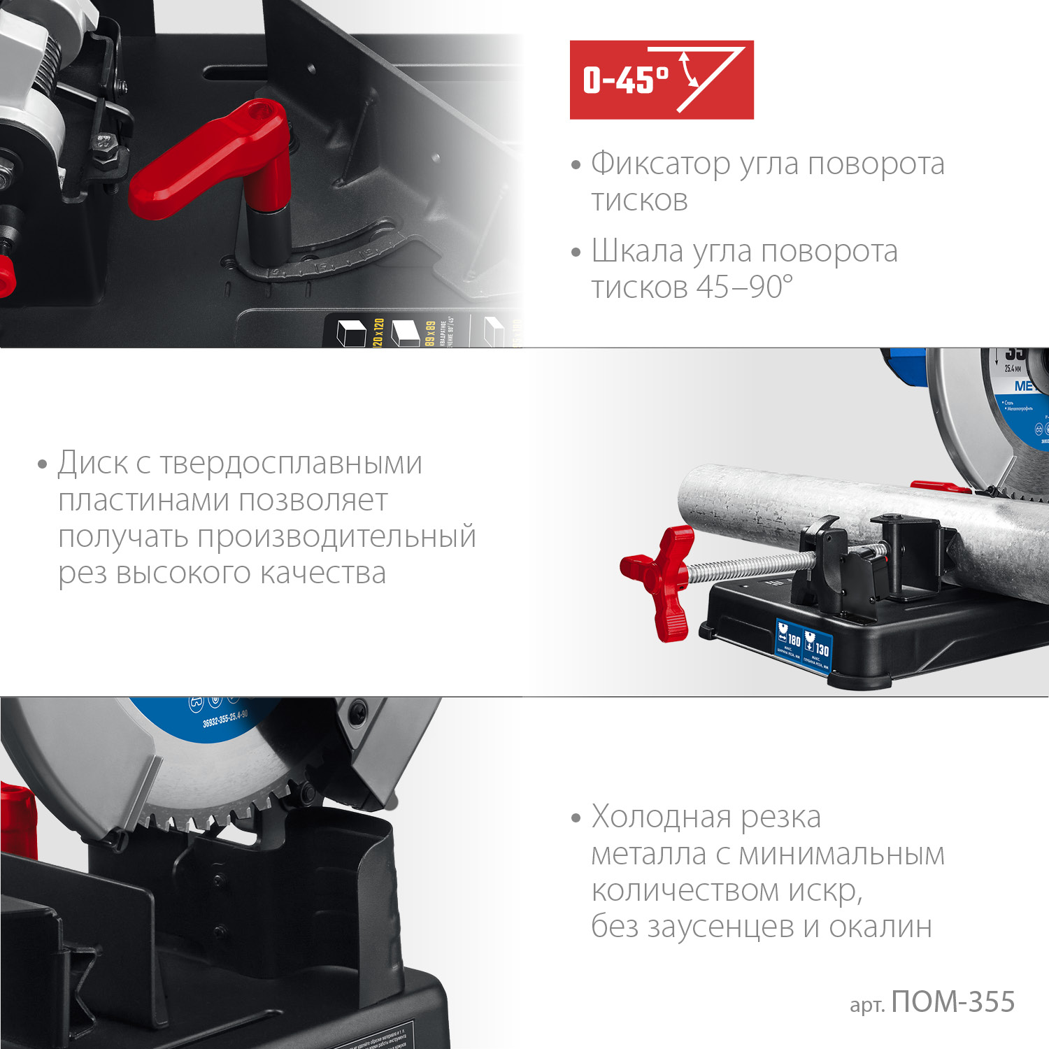 ПОМ-355 Профессиональная отрезная пила для пильных дисков по металлу. Диск с твердосплавными пластинами (в комплект не входит), позволяет получить стабильный производительный рез высокго качества, с минимальным количеством искр, без заусенцев и окалин.