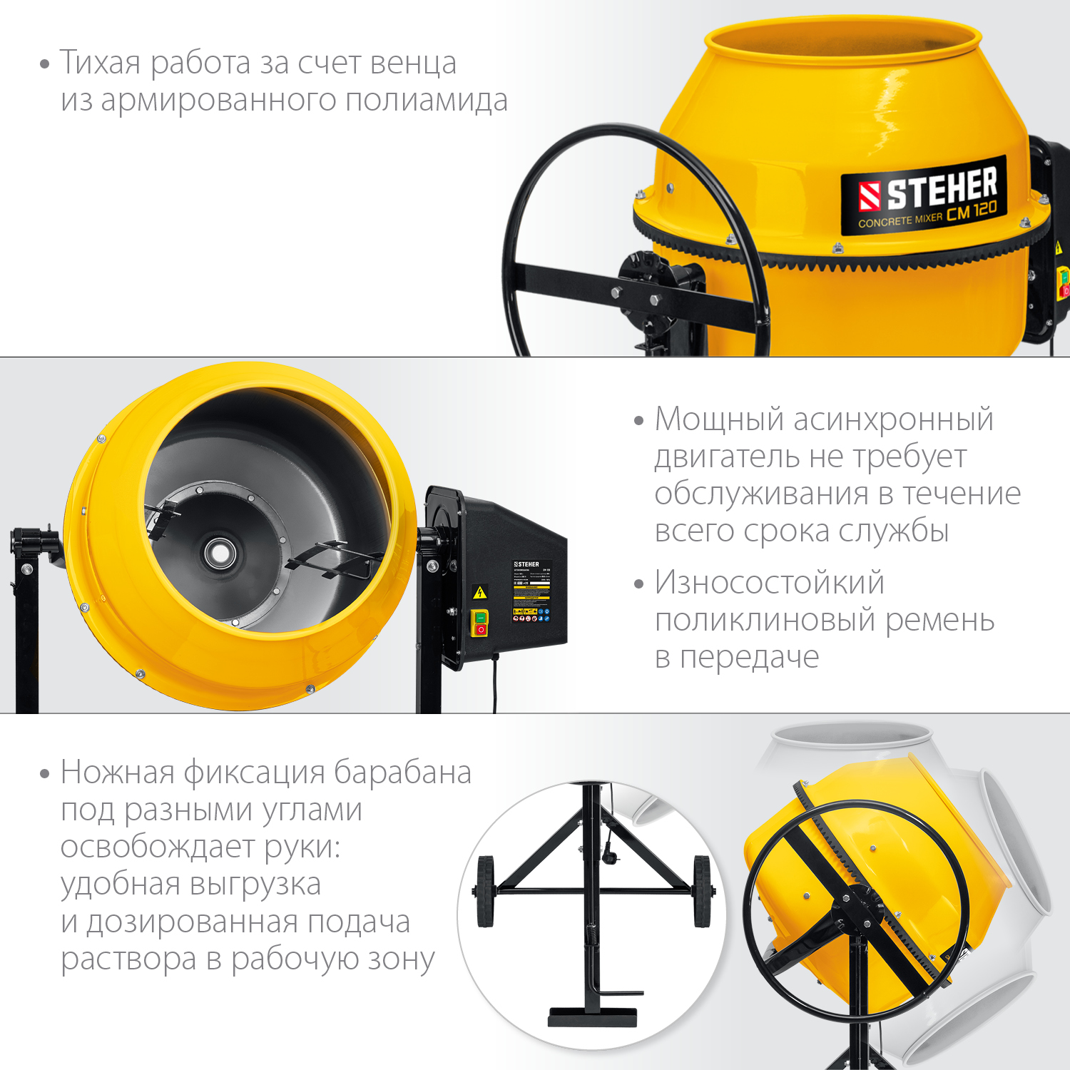 Эффективный и мощный инструмент с объемным барабаном, удобной регулялировкой угла наклона барабана и износостойким венцом из армированного полиамида является незаменимым помощником в строительных работах на стройплощадке.