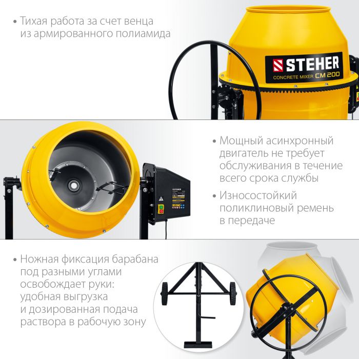 Эффективный и мощный инструмент с объемным барабаном, удобной регулялировкой угла наклона барабана и износостойким венцом из армированного полиамида является незаменимым помощником в строительных работах на стройплощадке.