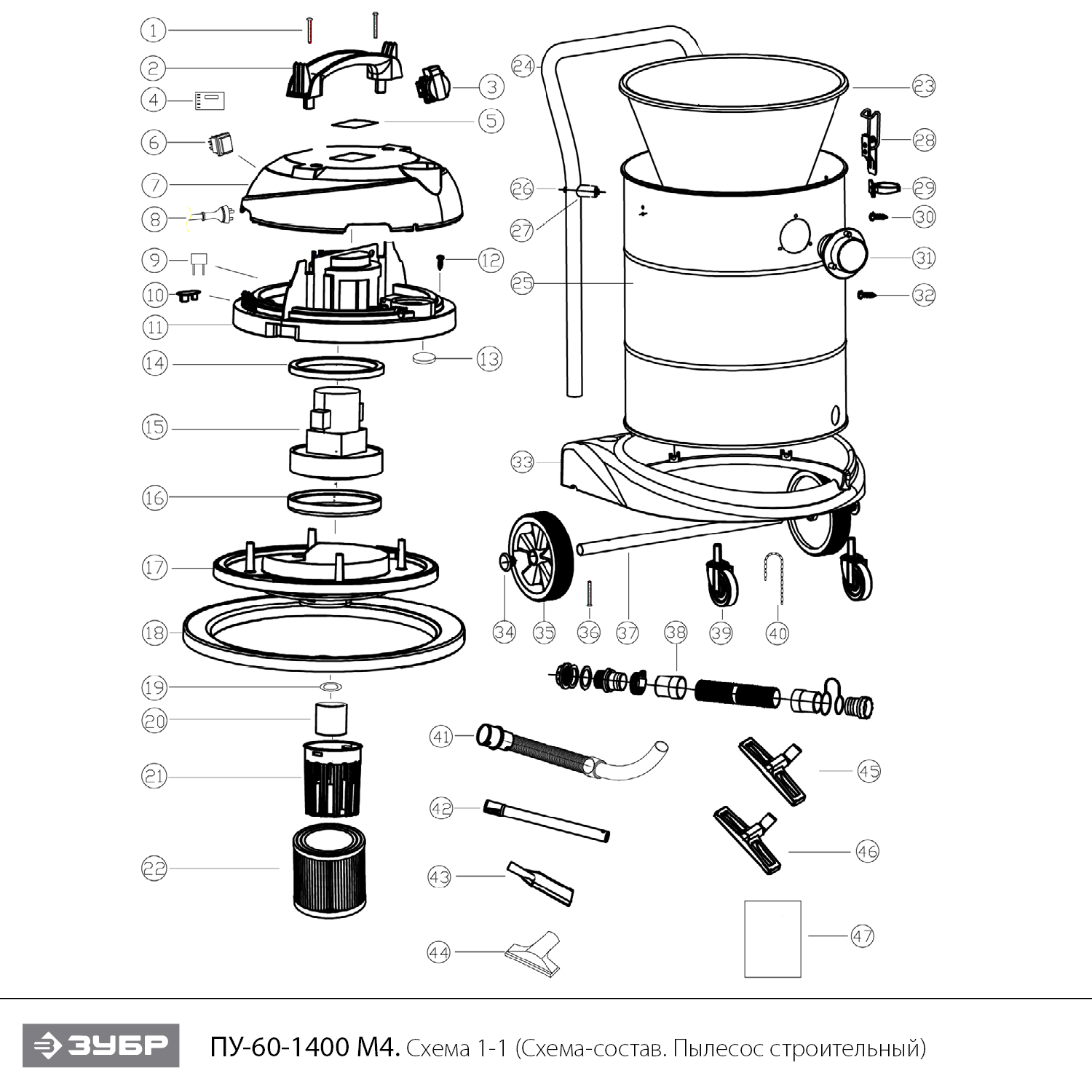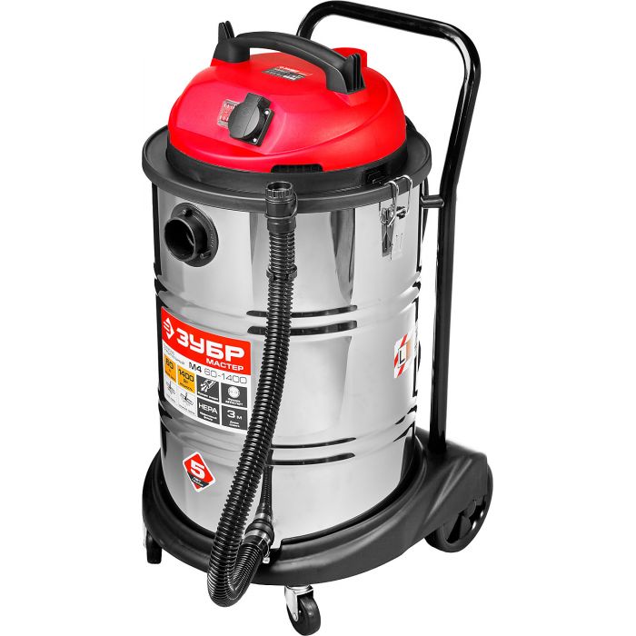 Строительный пылесос ЗУБР предназначен для уборки помещений, а также для принудительного удаления продуктов пиления, строгания, фрезерования и т.п. из рабочей зоны электроинструмента. Он незаменим для поддержания чистоты в гараже, мастерской, удаления мусора во время ремонта в квартире или на даче. Бак из нержавеющей стали объемом 60 л очень долговечен. а синхронное включение с инструментом, подключенным через розетку пылесоса позволит сохранить чистоту на рабочем месте.