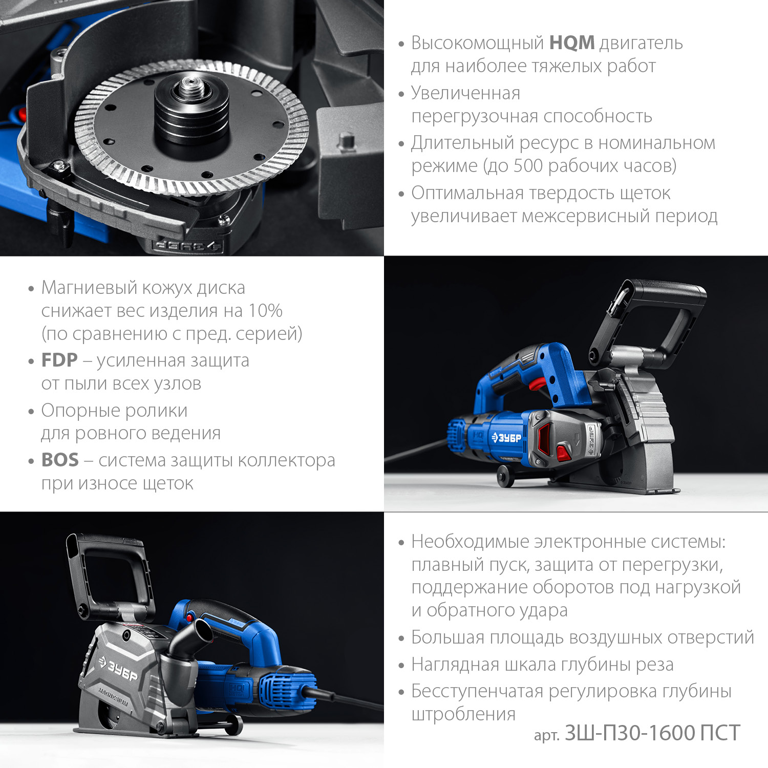 Профессиональный инструмент с мощным двигателем для выполнения штроб глубиной до 30 мм в кирпиче и легких бетонах. Оснащен всеми современными электронными системами (плавный пуск, константная электроника, защита от перегрузки) для безопасности и большей производительности. Полная пылезащита всех узлов и комплектующие высокого класса гарантируют надежность