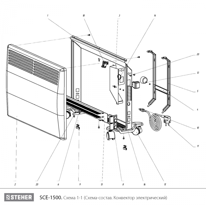 -Конвектор электрический, шт, 1 шт, -Крогштейн, шт, 1 шт, -Ролик, шт, 4 шт, -Опора, шт, 2 шт, -Набор крепежа, шт, 1 шт, -Руководство по эксплуатации,