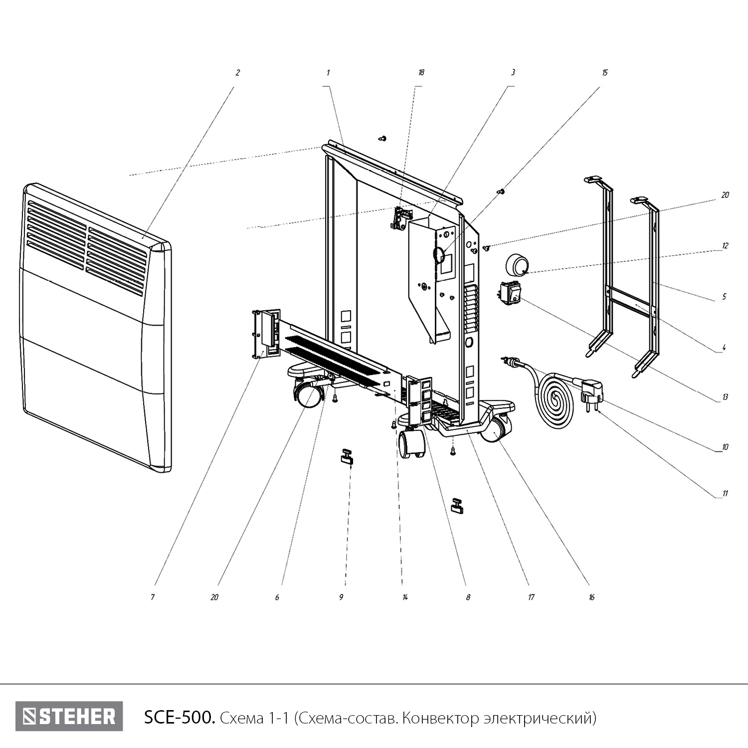 -Конвектор электрический, шт, 1 шт, -Крогштейн, шт, 1 шт, -Ролик, шт, 4 шт, -Опора, шт, 2 шт, -Набор крепежа, шт, 1 шт, -Руководство по эксплуатации,