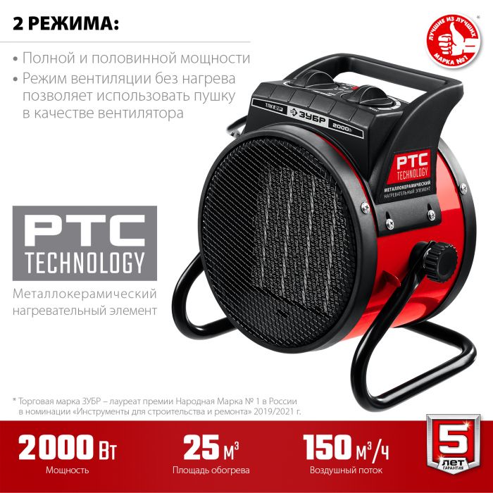 Электрические тепловые пушки ЗУБР серии ТПК–Р компактные пушки в круглом корпусе для обогрева небольших помещений. Благодаря небольшим размерам тепловую пушку легко переносить и хранить. Устройства оснащены долговечным металлокерамическим нагревательный элементом, обеспечивающий быстрый равномерный нагрев, экономное потребление электроэнеергии и не сушит воздух. Механический терморегулятор поддерживает нужную температуру нагрева. За счет большой площади теплообмена и небольшой температуры нагрева элемента, воздух быстро прогревается. Изделие можно оставлять на долгое время и не бояться за сохранность помещения, так как конструктивные меры безопасности защищают Вас и изделие при нештатных ситуациях.