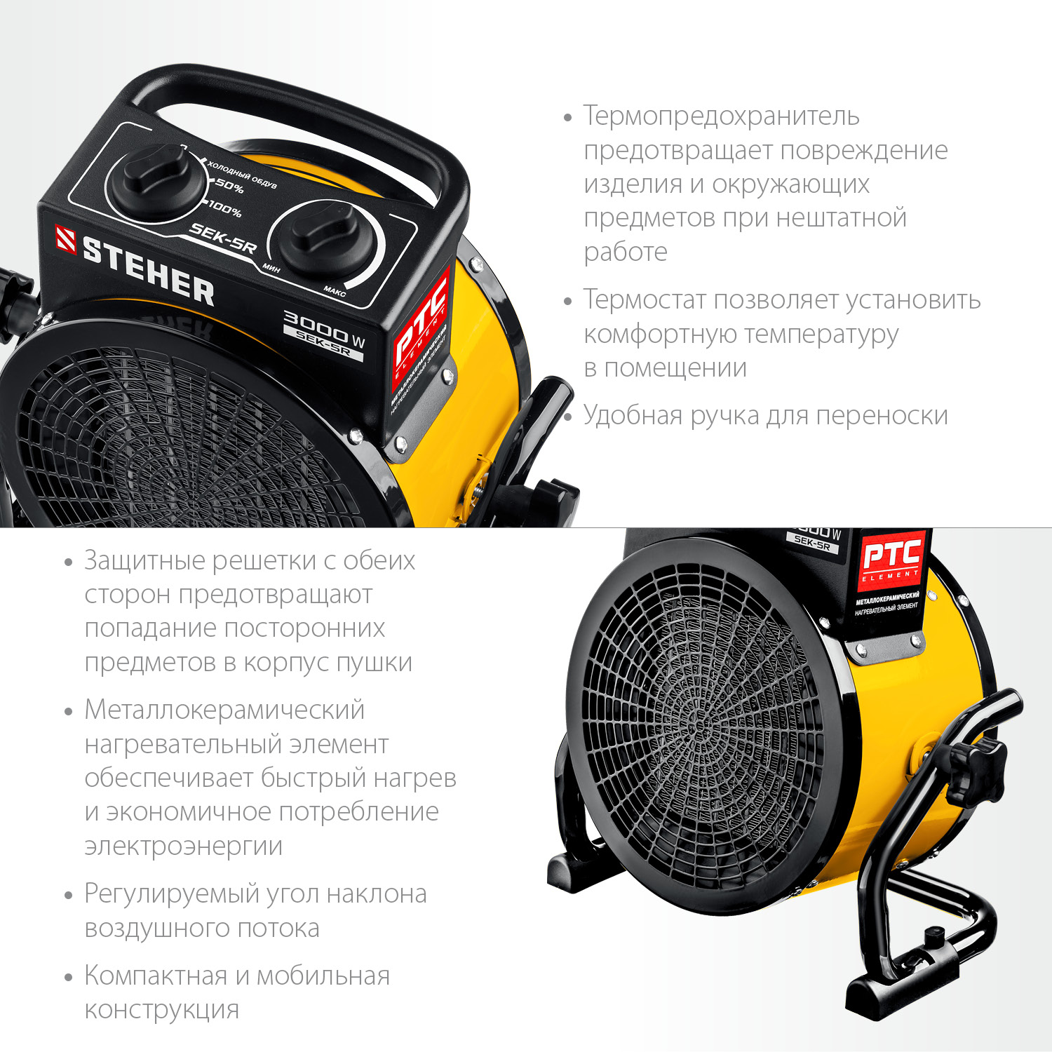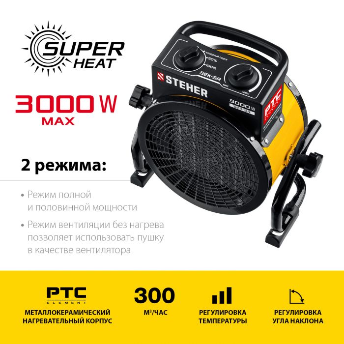 Электрические тепловые пушки STEHER серии SEK – компактные пушки в круглом корпусе для обогрева небольших помещений. Благодаря небольшим размерам тепловую пушку легко переносить и хранить. Устройства оснащены долговечным металлокерамическим нагревательный элементом,обеспечивающий быстрый равномерный нагрев, экономное потребление электроэнеергии и не сушит воздух. Механический терморегулятор поддерживает нужную температуру нагрева.За счет большой площади теплообмена и небольшой температуры нагрева элемента, воздух быстро прогревается. Изделие можно оставлять на долгое время и не бояться за сохранность помещения, так как конструктивные меры безопасности защищают Вас и изделие при нештатных ситуациях.