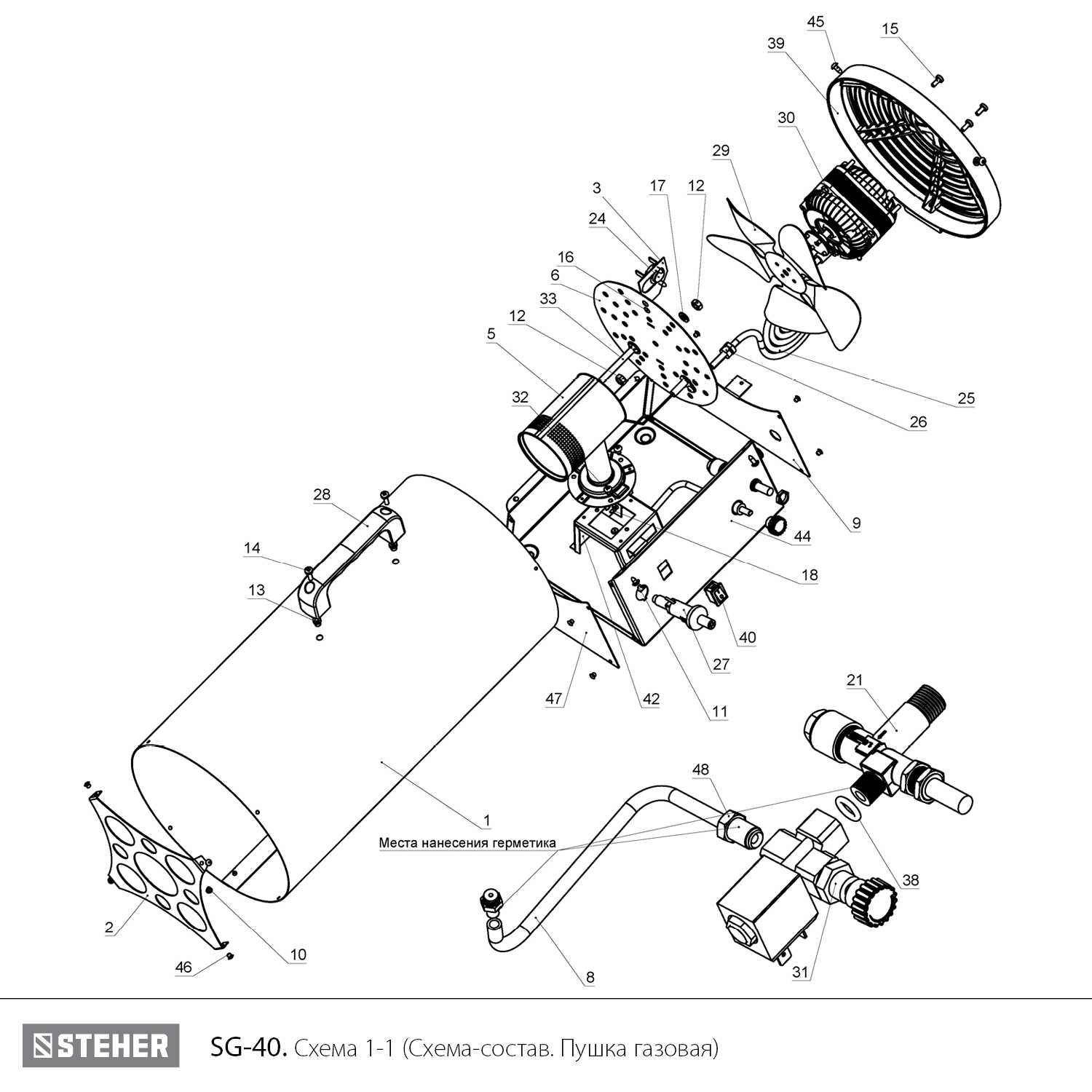 --Газовая тепловая пушка, шт, 1 шт, -Газовый шланг с редуктором, шт, 1 шт, -Ручка, шт, 1 шт, -Винт крепёжный, шт, 2 шт,, шт, 1 шт, -Газовый шланг с ре: