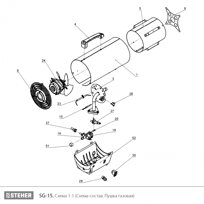 -Газовая тепловая пушка, шт, 1 шт, -Газовый шланг с редуктором, шт, 1 шт, -Ручка, шт, 1 шт, -Винт крепёжный, шт, 2 шт,